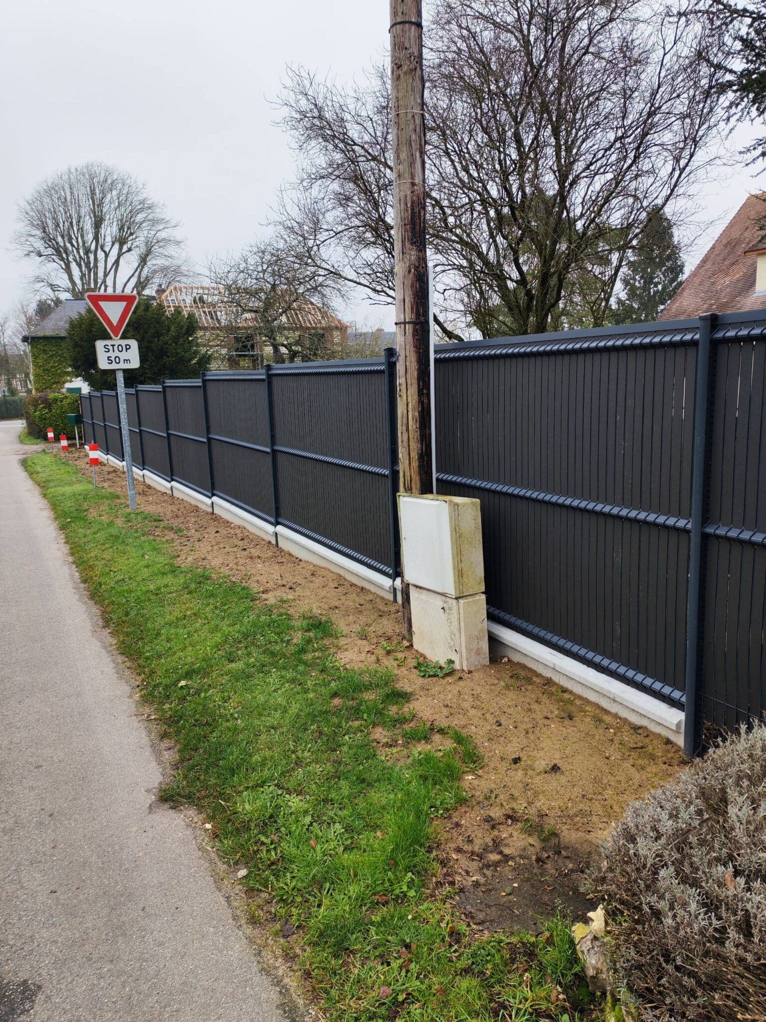 Nous utilisons des matériaux courants et robustes : panneaux métalliques ou composite, poteaux métalliques traités, semelles et longrines en béton, visserie inox, scellements et matériaux de remblai (gravier, géotextile). Pour les finitions paysagères, nous proposons terre végétale, paillage, plantes de haie ou pose de gazon selon vos choix, sans engagement sur marques spécifiques.